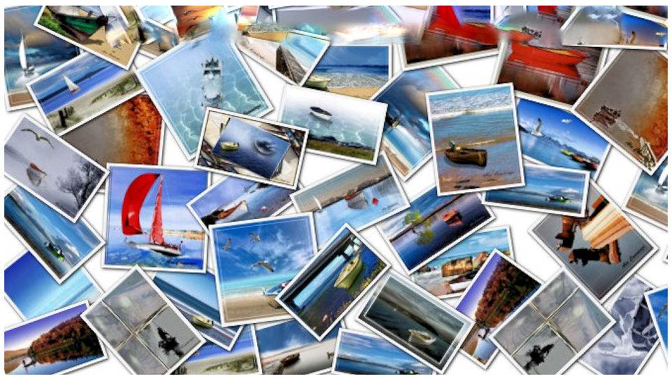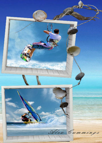 Below is a pair of water sports scenes framed and a beach and sea scene used as background
