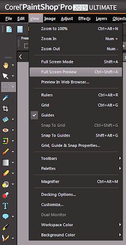 One of the functions I love about PaintShop Pro is a very simple but effective tool which lets you see your image outside the workspace. Yes just the image no other clutter to distract you, it is great no headings borders or any distraction at all I have tried many products over the yeas and wished they had this. just two mouse clicks as shown below.